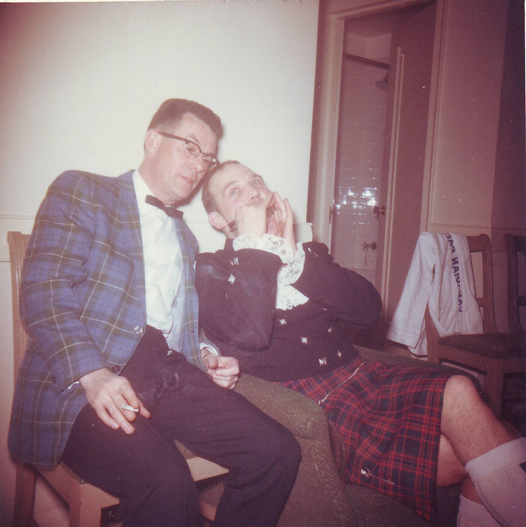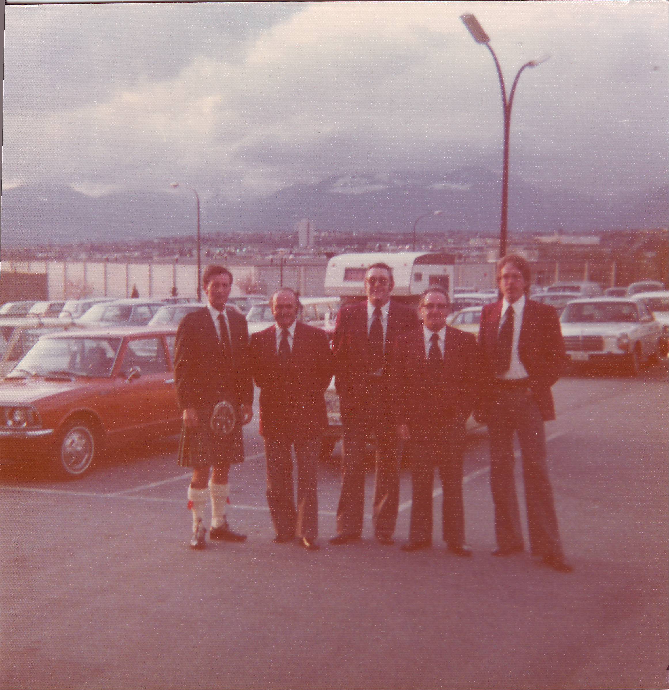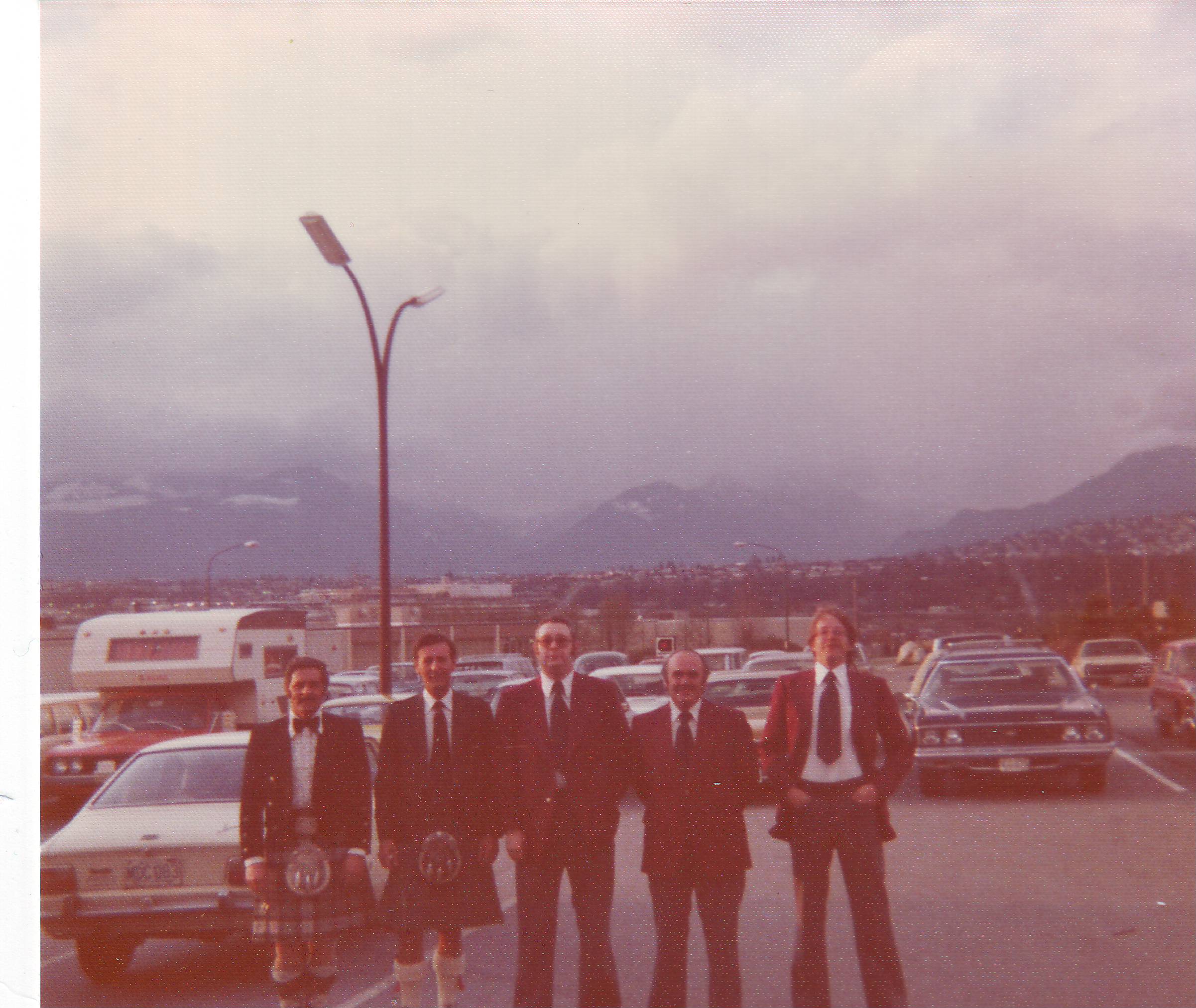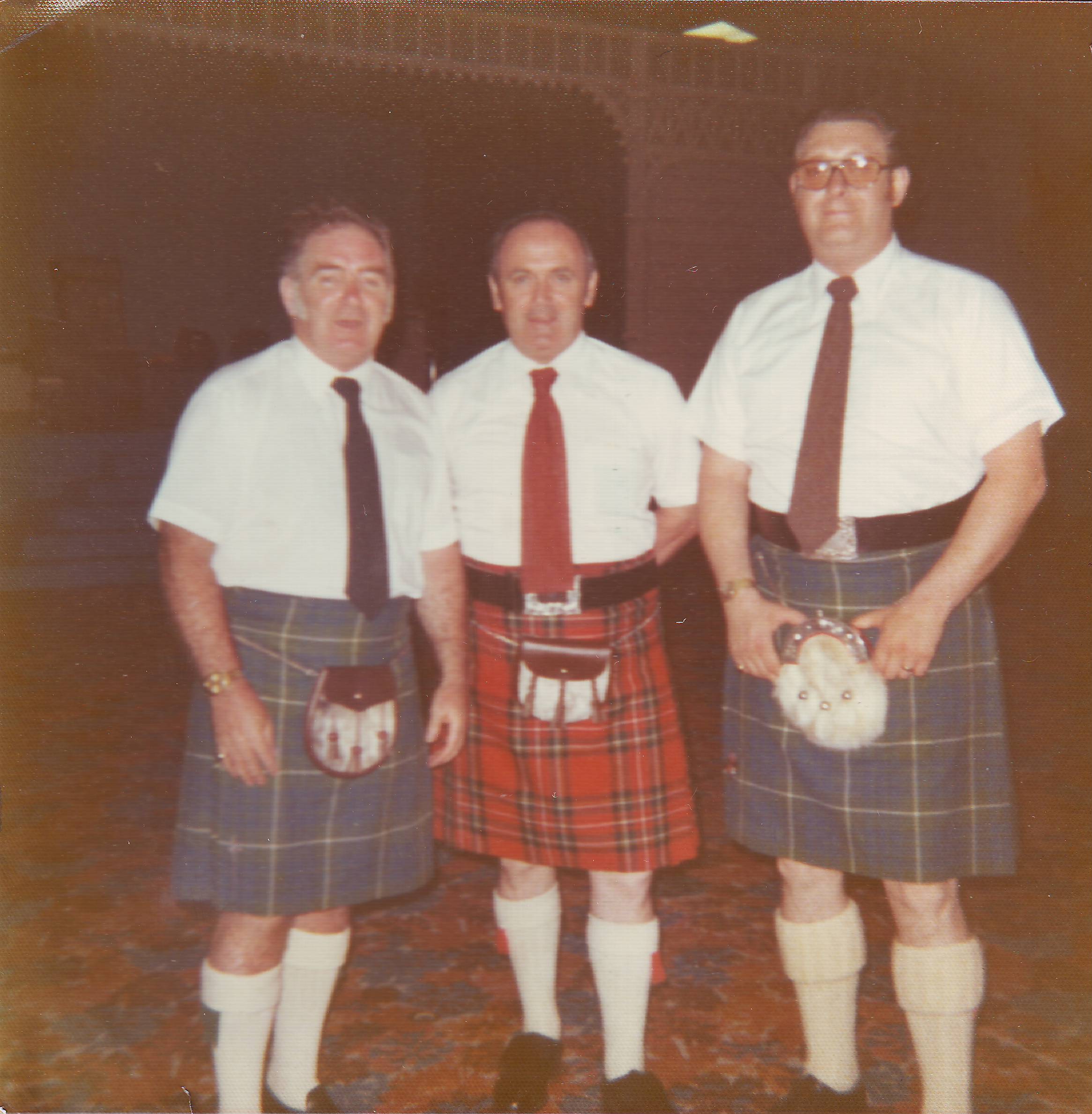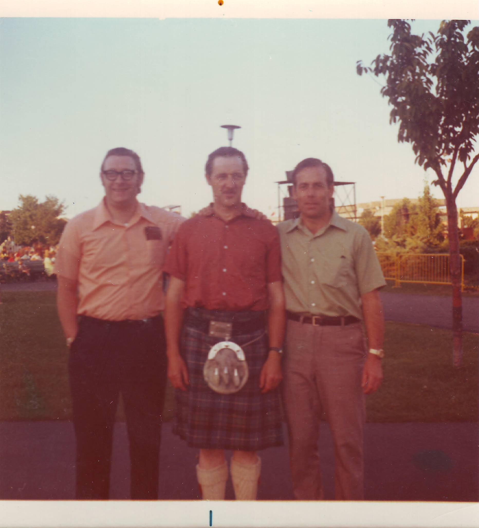 BB, Scottish guest fiddler Farquar McRae, Angus McKinnon on the CNE grounds after the bandshell show at Scottish World Festival 1960s